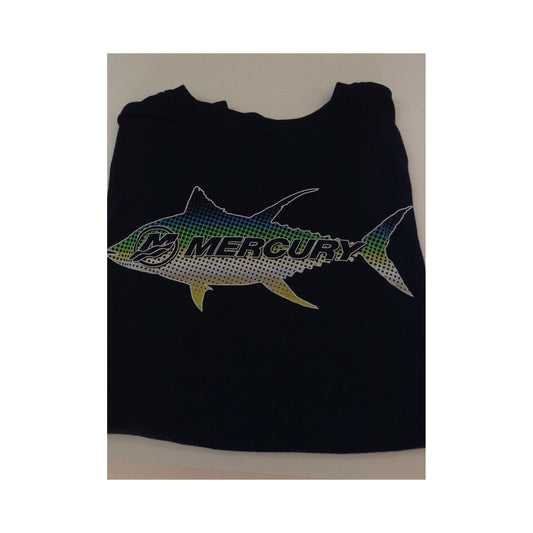 New Authentic Mercury Marine Short Sleeve Shirt Navy Blue/ Fish w/Mercury Strikethrough