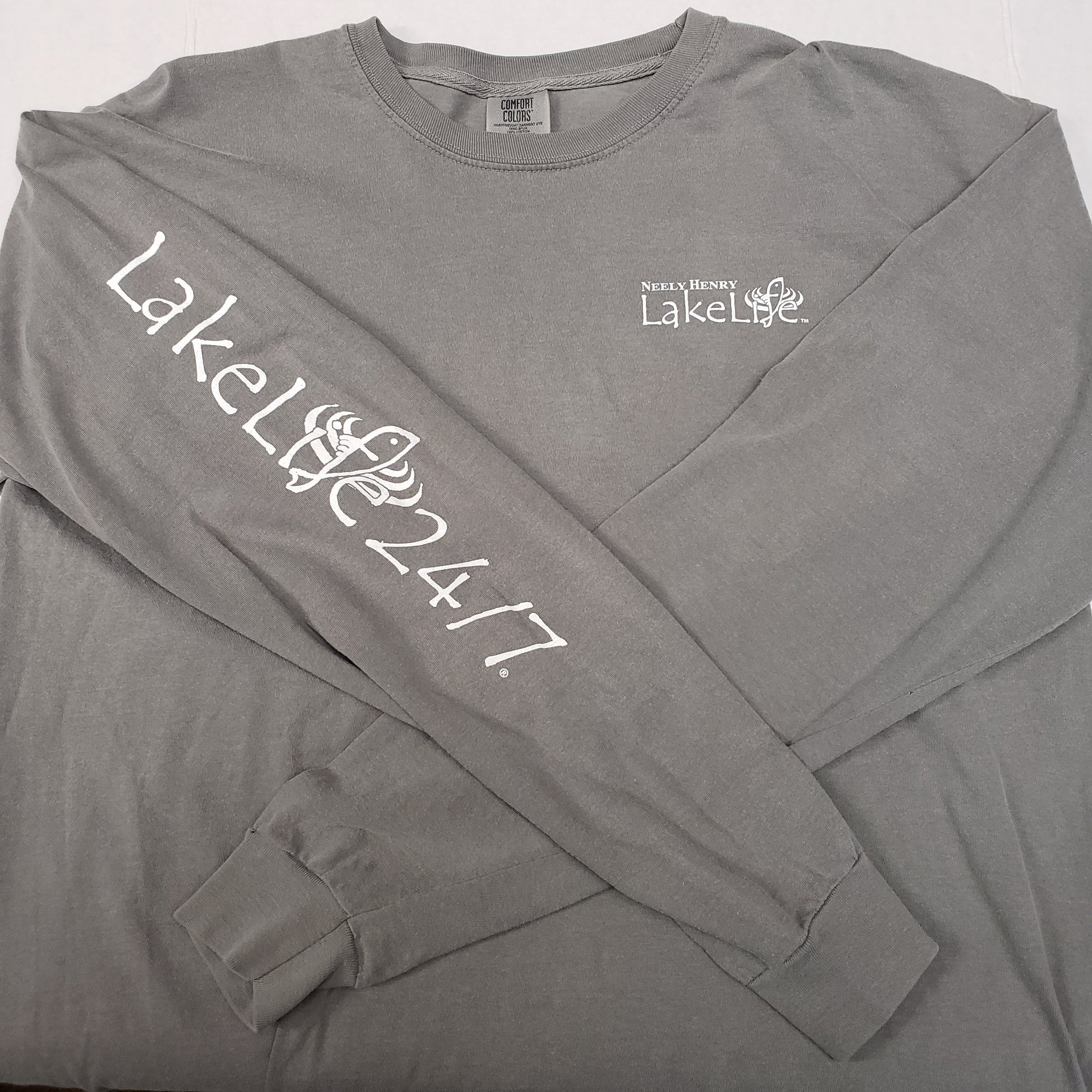 High quality shirts with LakeLife logo above left breast, LakeLife 24/7 logo vertically down right sleeve and a fish with water ripples logo on back near neck.