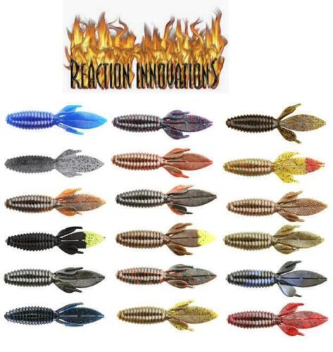 Reaction Innovations' soft plastic baits are becoming the hottest baits in the bass fishing market. The reason for their success is easy to see once you get one of their baits in your hands. Reaction Innovations has been able to perfect fantastic two and three color shots that give the Sweet Beaver great swirl and two-tone patterns unlike anything you or the fish have ever seen. Also adding to the great success of the Sweet Beavers is the unique design. Owner and pro fishermen, Andre Moore, has taken his years of on the water experience and created a bait that is tough and compact, but moves a lot of water and has lots of action in almost any situation. The body of the Sweet Beaver features forward facing ribs that create lots of pressure waves that let bass know something is moving and offers bass a texture that they seem to like when they inhale the lure. The centerline is recessed for better hook penetration but the 'nose' of the lure is thick to hold your hook without tearing on every fish. The long, flat, beaver tail is textured on the flat surfaces and along the edge, and it's splitable so you can have a twin tail look, an attention to detail not seen in most soft plastic lures. The Sweet Beaver also has additional tails set at 90 degrees to the beaver tail for fish attracting movement no matter which way the lure is moved.